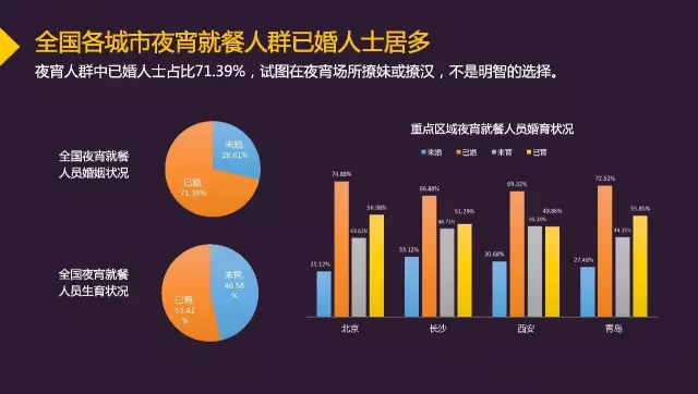 性别:夜宵消费者中六成以上是男性,女性比例仅占38.78%,但长沙消费夜宵的女性占当地总消费人群的44.35%,高于其他城市。