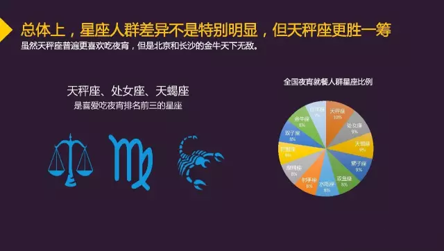 星座:最爱吃夜宵的星座为天秤座(10.41%)处女座(9.05%)天蝎座(8.98%);最不爱吃夜宵的星座为白羊座、金牛座和双子座。